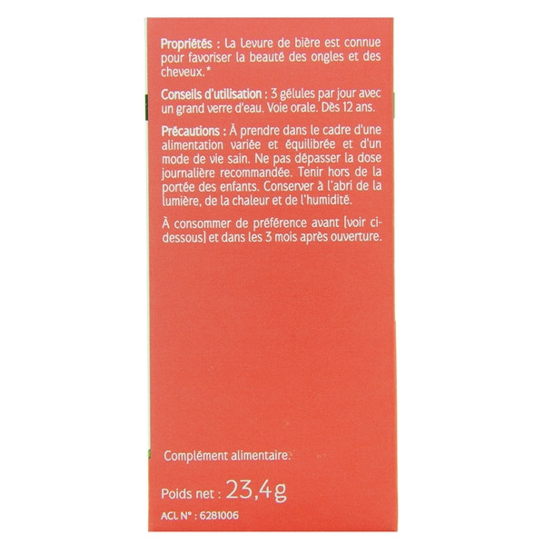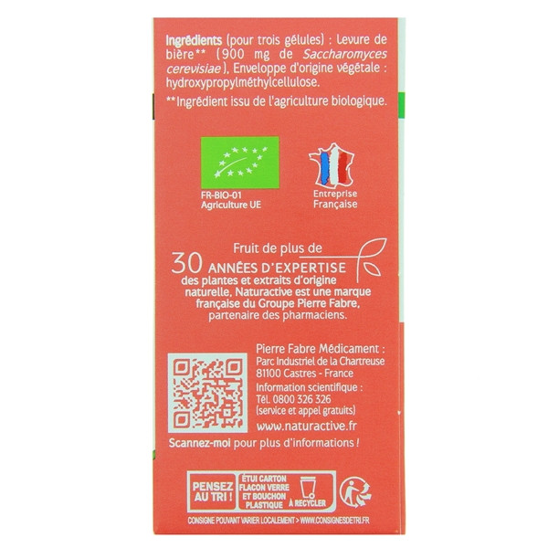 Levure de bière (Saccharomyces cerevisiae) - Analyse nutritionnelle par gélule : 300 mg de levure de bière.