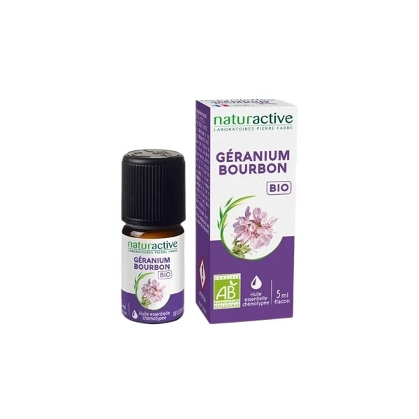 L’Huile Essentielle Géranium Bourbon Bio des laboratoires Naturactive est indiquée pour contribuer à redonner de l'éclat au teint terne, aider à luter contre l'acné et aider à lutter contre les mycoses cutanées et vaginales. De plus, cette huile essentielle est idéale en cas de cheveux gras.