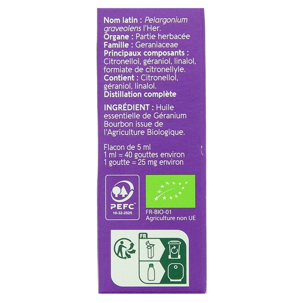Naturactive vous propose cette huile essentielle de géranium issue d’une distillation respectueuse de la plante, pour une qualité optimale. Certifiée biologique, cette huile est 100 % pure et naturelle, sans aucun ajout de substances synthétiques, garantissant ainsi une utilisation en toute confiance. Vous pouvez de ce fait profiter pleinement de ses bienfaits sur le corps et l’esprit.