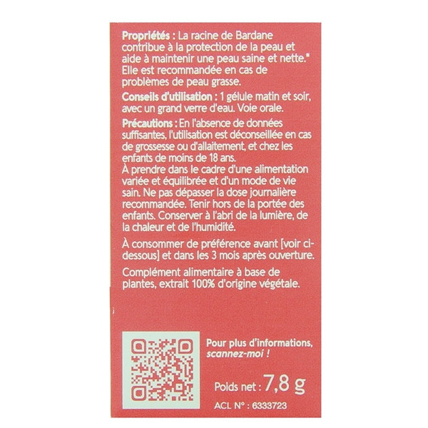Bardane Bio est un complément alimentaire naturel et certifié bio des Laboratoires Pierre Fabre. Il s’agit d’un produit spécialement conçu pour aider à retrouver une peau éclatante et sans imperfections. Grâce à ses propriétés purifiantes et anti-inflammatoires, il contribue à réduire les marques disgracieuses sur la peau et à apaiser les irritations. Ce complément alimentaire Naturactive embarque une formule à base de :