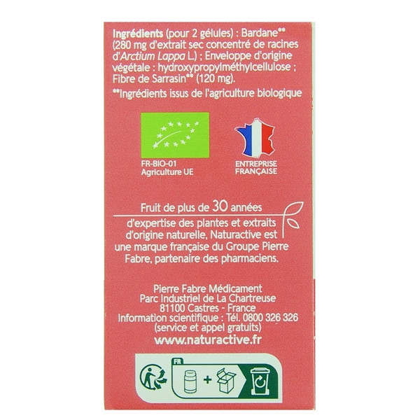 Bardane Bio de Naturactive est un complément alimentaire à base de plantes, extrait 100 % d'origine végétale. Il est indiqué pour favoriser une peau saine, nette et protégée.