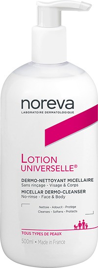 Les laboratoires Noreva proposent la lotion universelle nettoyante micellaire. Démaquillant très efficace, il nettoie profondément et adoucit la peau. Disponible en flacon de 500ml.
