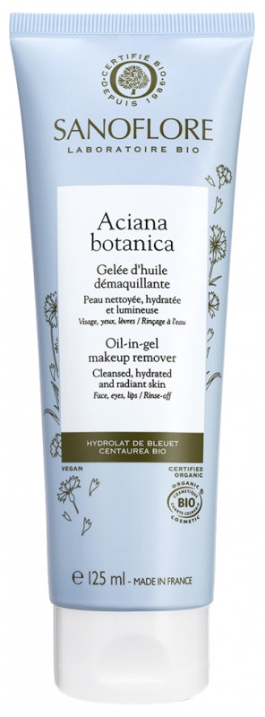 Riche et fondante, Sanoflore Aciana Botanica Gelée d'Huile Démaquillante Bio nettoie, hydrate et illumine toutes les peaux (visage, yeux et lèvres), et élimine les particules de pollution.