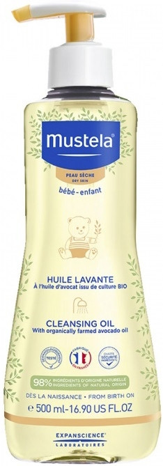 L'huile lavante de Mustela est disponible en flacon pompe de 500ml.