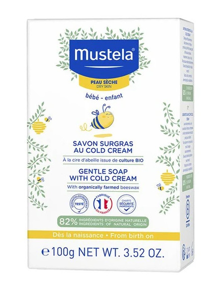 Le savon surgras au cold cream à la cire d'abeille bio nutri-protecteur des laboratoires Mustela est tout indiqué pour le nettoyage quotidien de la peau de bébé, des peaux sèches et des peaux ponctuellement agressées. Disponible en pain de 100 grammes.
