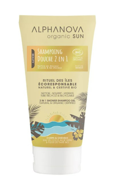 Prolongez le parfum des vacances avec Alphanova. Le shampoing douche 2 en 1 possède une formule douce sans sulfate, à base d'Eau de Coco bio et enrichie en Extrait de Fleur de Tiaré de Polynésie bio et Aloé Vera bio. Il nettoie la peau et les cheveux en douceur et les débarrasse efficacement des résidus de sel, chlore, sable et de crème de solaire.