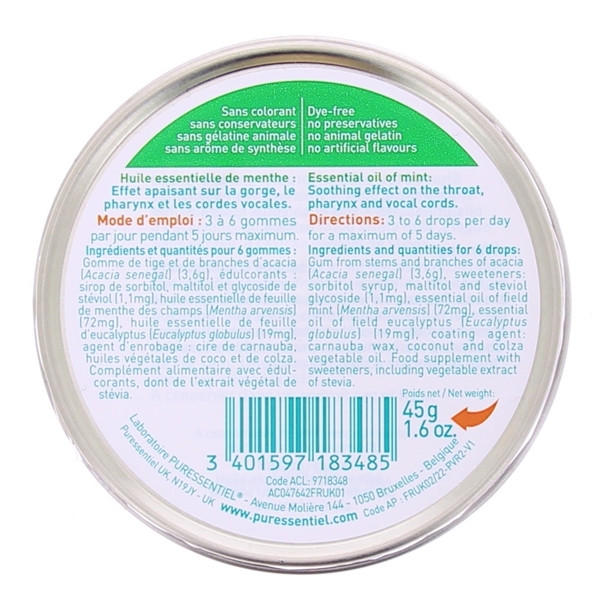 Gomme de tige et de branches d’acacia (Acacia senegal) (3,6 g), édulcorants : sirop de sorbitol, maltitol et glycoside de stéviol (1,1 mg), huile essentielle de feuille de menthe des champs (Mentha arvensis) (72 mg), huile essentielle de feuille d’eucalyptus (Eucalyptus globulus) (19 mg), agent d’enrobage : cire de carnauba, huiles végétales de coco et de colza. Complément alimentaire avec édulcorants, dont de l’extrait végétal de stévia.