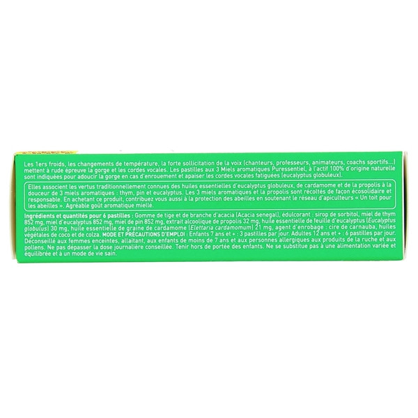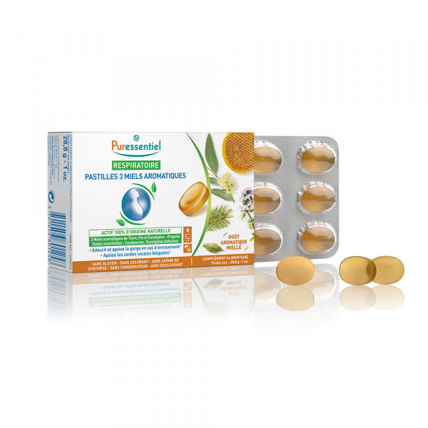 Les Pastilles Respiratoire 3 Miels Aromatiques de Puressentiel répondent aux besoins des voix fragilisées par les saisons froides, par la pollution ou par une sur sollicitation. Professeurs, chanteurs orateurs : ces pastilles ont été pensées pour vous. Elles adoucissent la gorge et atténuent l’enrouement grâce à des actifs naturels.