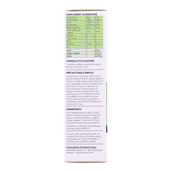 Huile végétale : Brassica napus* (Colza), Gelatin* (Gélatine), Glycerin* (Glycérine), Huiles essentielles : Origanum vulgare* (Origan vulgaire), Citrus limon* (Citron), Antioxydant : extrait riche en Tocophérol.