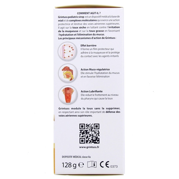 Grintuss Pediatric est un produit à base de miel et de complexes moléculaires qui exerce une action protectrice et par conséquent lénitive des voies aériennes supérieures.