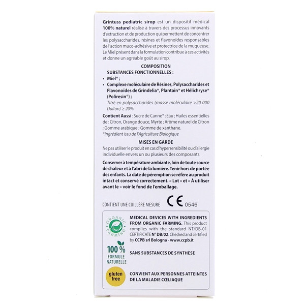 Grintuss Pediatric calme la toux en protégeant la muqueuse. Indiqué pour le traitement de la toux sèche et grasse chez les enfants à partir d'1 an. Sirop à base de miel et de complexes moléculaires de Grindelia, de Plantain, et d'Hélichryse.
