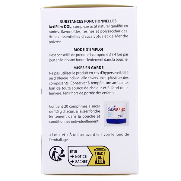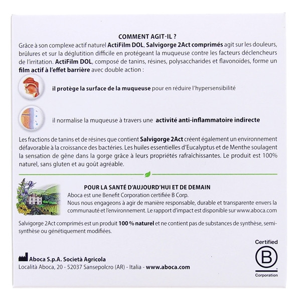 Grâce à son complexe moléculaire végétal ActiFilm DOL, Salvigorge 2Act agit sur les douleurs, brûlures et sur la déglutition difficile en protégeant la muqueuse contre les facteurs déclencheurs de l’irritation.