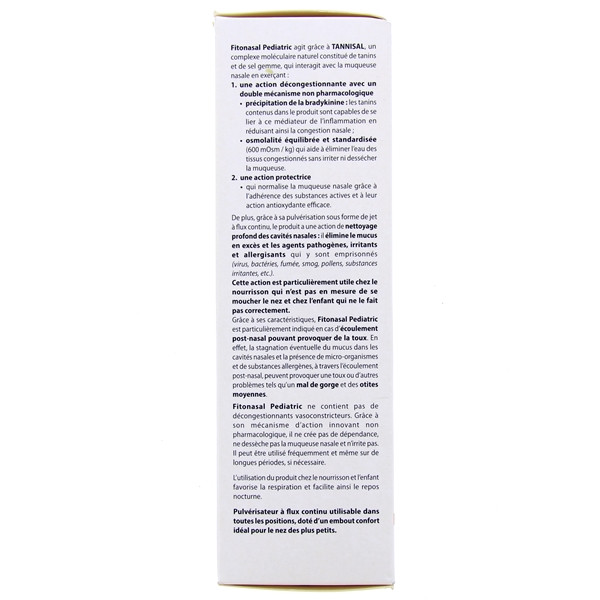 Fitonasal Pediatric ne contient pas de décongestionnants vasoconstricteurs et, grâce à son mécanisme d'action non pharmacologique, il ne dessèche pas la muqueuse nasale et n'irrite pas. Il peut être utilisé fréquemment et même sur de longues périodes, si nécessaire. L’utilisation du produit chez le nourrisson et l’enfant favorise la respiration et facilite ainsi le repos nocturne.