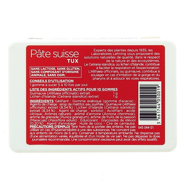 La Pâte Suisse TUX constitue une solution naturelle pensée pour soulager efficacement la gorge en cas de toux. Ce produit de Lehning est présenté sous forme de pâtes à sucer au goût fruité de grenade et de fruit de la passion.