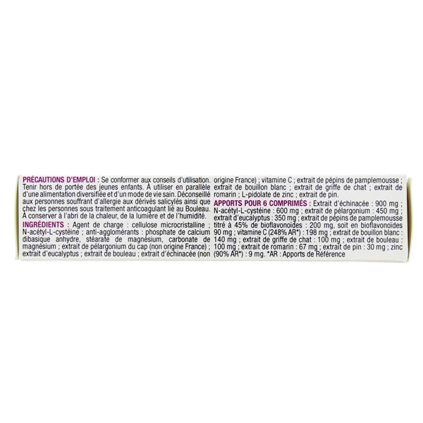 Agent de charge : cellulose microcristalline ; N-acétyl-L-cystéine ; antiagglomérants : phosphate de calcium dibasique anhydre, stéarate de magnésium, carbonate de magnésium ; extrait de pélargonium du cap; extrait d’eucalyptus ; extrait de bouleau ; extrait d’échinacée ; vitamine C enrobée ; extrait de pépins de pamplemousses ; extrait de bouillon blanc ; extrait de griffe de chat ; extrait de romarin ; L-pidolate de zinc ; extrait de pin.
