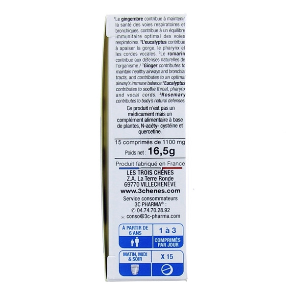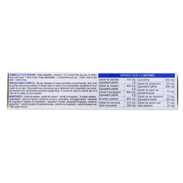 Extrait de plantain ; extrait de romarin ; extrait d'eucalyptus ; N-acetyl-cysteine ; épaississant : gomme d'acacia ; extrait de curcuma ; quercétine ; anti-agglomérant : carbonate de magnésium, stéarate de magnésium ; régulateur d'acidité : phosphate tricalcique ; extrait de gingembre ; extrait de pépin de pamplemousse ; extrait de pin sylvestre ; extrait de poivre noir.