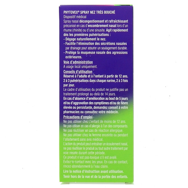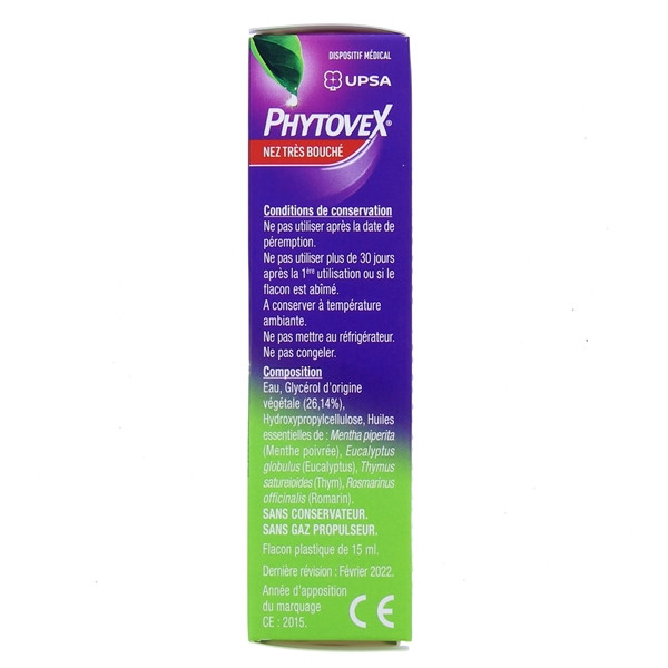 Phytovex Nez très bouché des laboratoires UPSA est un spray nasal indiqué pour dégager le nez et protéger la muqueuse des adultes et des adolescents de plus de 12 ans en cas d'encombrement nasal lors d'un rhume (rhinite) ou d'une sinusite.