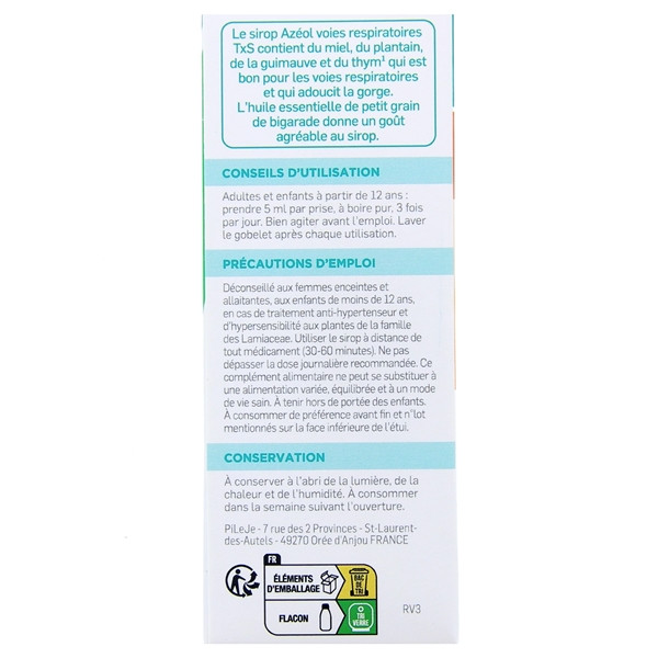 Ce sirop est déconseillé aux femmes allaitantes et aux femmes enceintes ainsi aux enfants de moins de 6 ans. Il est déconseillé aux personnes sous traitement anti hypertenseur. La prise doit être distancée de 30 à 60 mn de toute autre prise de médicament. Azéol sirop toux sèche est un complément alimentaire. Il ne peut se substituer à une alimentation variée et équilibrée dans le cadre d’un mode de vie sain. La dose journalière recommandée doit être respectée. Le produit doit être conservé à l’abri de la lumière, de la chaleur et de l’humidité et hors de portée des enfants.