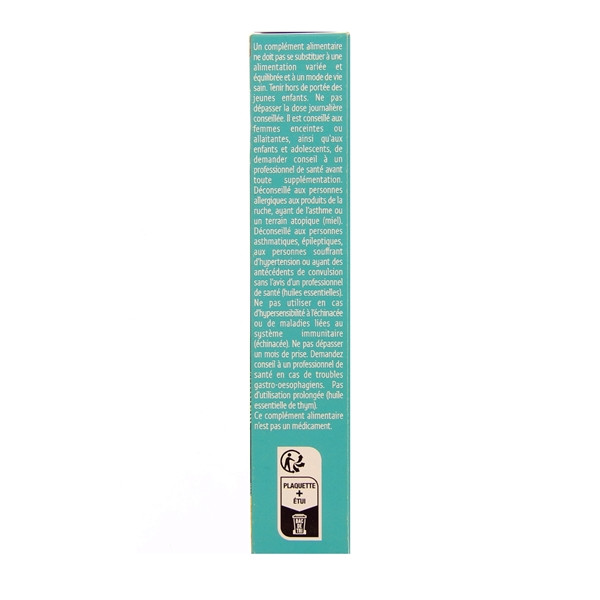 Ingrédients: (par dose journalière) : agents de charge (cellulose microcristalline, crospovidone), antiagglomérants (phosphate tricalcique, carbonate de magnésium, sels de magnésium d’acides gras, dioxyde de silicium [nano]), extrait de bouillon blanc (Verbascum Thapsus L.) (200 mg correspondant à 800 mg EP), extrait de lichen d’Islande (Cetraria islandica (L) Ach.) (125 mg correspondant à 500 mg EP), miels (toutes fleurs et eucalyptus), extrait d’eucalyptus (Eucalyptus globulus Labill.) (100 mg correspondant à 1 000 mg EP), vitamines (C, D3), extrait de sureau (Sambucus nigra L.) (75 mg correspondant à 3 000 mg EP), extrait d’échinacée pourpre (Echinacea purpurea (L.) Moench) (37,5 mg correspondant à 150 mg EP), huiles essentielles d’eucalyptus (Eucalyptus globulus Labill.) (20 mg), de thym (Thymus zygis L.) (10 mg) et d’orange douce (Citrus sinensis (L.) Osbeck) (5 mg). EP = Equivalent Plante.