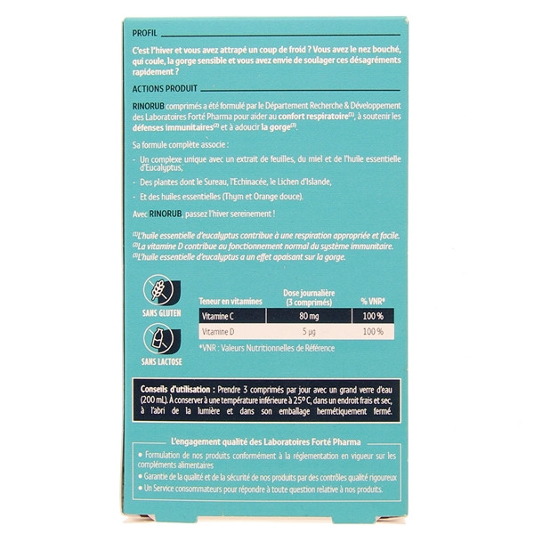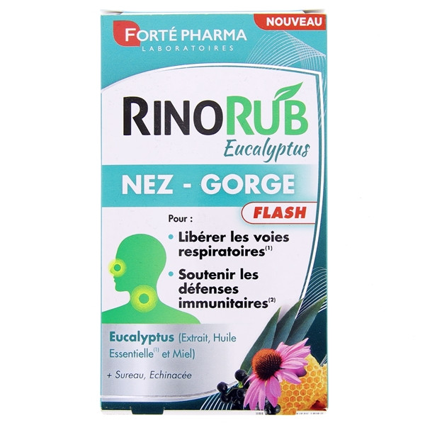 Rinorub Eucalyptus Nez Gorge Flash du laboratoire Forté Pharma est un complément alimentaire indiqué pour libérer les voies respiratoires et soutenir les défenses immunitaires.