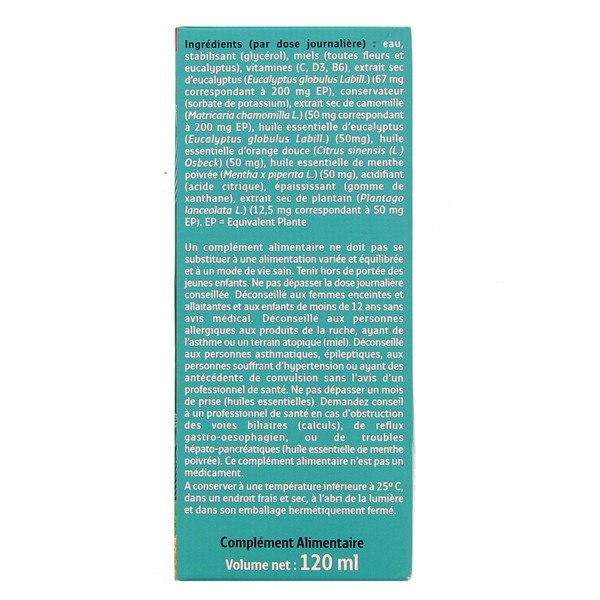 (par dose journalière) : eau, stabilisant (glycérol), miel (toutes fleurs et eucalyptus), vitamines (C, B6, D3), extrait sec d’eucalytpus (Eucalyptus globulus Labill.) (67 mg correspondant à 200 mg EP), conservateur (sorbate de potassium), extrait sec de camomille (Matricaria chamomilla L.) (50 mg correspondant à 200 mg EP), huile essentielle d’eucalyptus (Eucalyptus globulus Labill.) (50mg), huile essentielle d’orange douce (Citrus sinensis (L.) Osbeck) (50 mg), huile essentielle de menthe poivrée (Mentha x piperita L.) (50 mg), acidifiant (acide citrique), épaississant (gomme de xanthane), extrait sec de plantain (Plantago lanceolata L.) (12,5 mg correspondant à 50 mg EP). EP = Equivalent Plante.