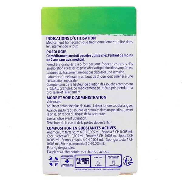 Stodal Granules du laboratoire Boiron est un médicament homéopathique indiqué dans le traitement de la toux.