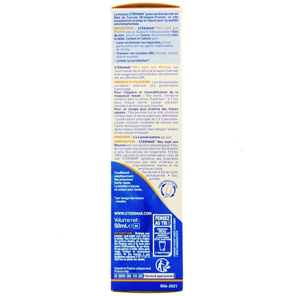 Stérimar Nez sujet aux rhumes est une solution formulé à base d'eau de mer 100 % naturelle et de cuivre pour prévenir les troubles ORL et limiter la surinfection.