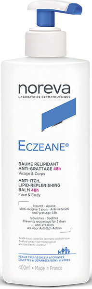 Fabriqué en France par les laboratoires NOREVA, le baume relipidant Eczéane anti grattage, a été testé sous contrôle dermatologique. Il est conditionné en flacon-pompe de 400 ml.