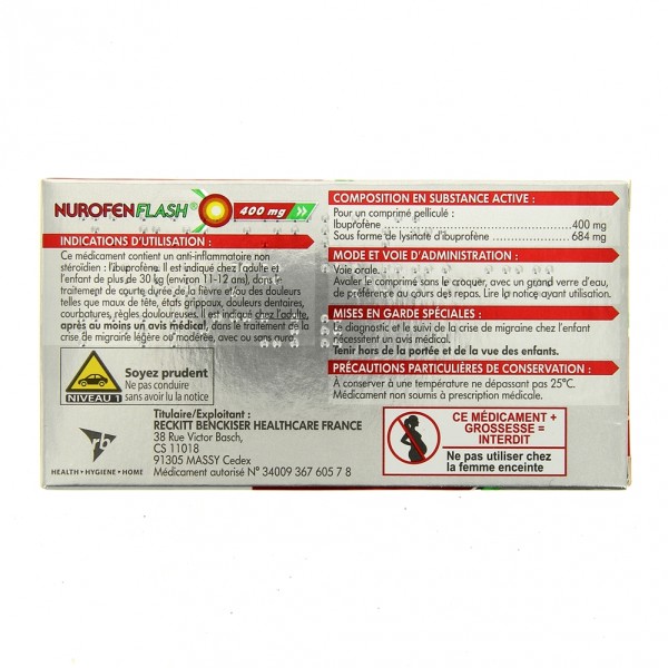 NurofenFlash est un médicament à base d'ibuprofène. NurofenFlash permet de combattre la douleur et la fièvre. Grâce à sa forme Flash, NurofenFlash agit plus vite qu'un Nurofen classique. Dosé à 400mg d'ibuprofène, NurofenFlash 400mg est disponible sur le site internet de notre pharmacie en ligne en boîte de 12 comprimés pelliculés.