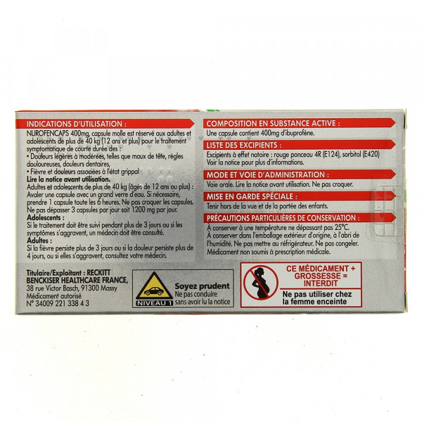 NurofenCaps 400mg est un médicament à base d'ibuprofène. NurofenCaps est recommandé pour lutter contre les douleurs et la fièvre. Dosé à 400mg d'ibuprofène, NurofenCaps est disponible sur notre pharmacie en ligne en boîte de 10 capsules molles.