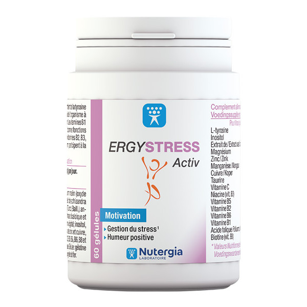 ERGYSTRESS Activ associe de la L-tyrosine à du schizandra, qui aide l’organisme à faire face au stress passager et contribue à la résistance physique et mentale. La formule contient aussi des vitamines B2, B3, B6, B9 et C et du magnésium qui contribuent à des fonctions psychologiques normales et participent à réduire la fatigue.