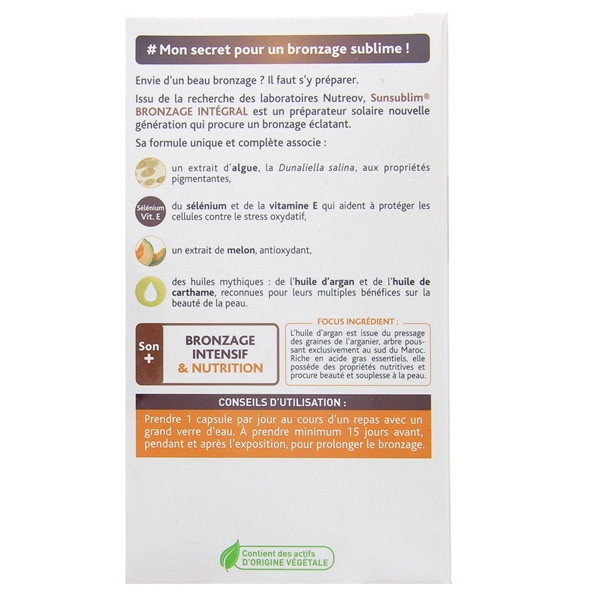 Fabriqué en France, le Sunsublim Bronzage intégral en offre spéciale de 3 mois est conçu par Nutreov, des laboratoires spécialisés dans les compléments alimentaires. Il est à prendre dans le cadre d’une alimentation variée et équilibrée.