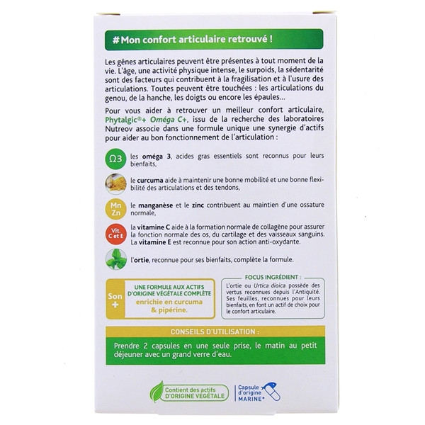 Phytalgic Oméga C+ Confort Articulations est un complément alimentaire enrichi en curcuma développé par les laboratoires Nutreov. Il est indiqué pour vous aider à retrouver une souplesse et un fonctionnement articulaire, une ossature normale ainsi qu'une flexibilité et une mobilité.