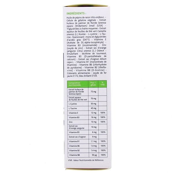 Huile de pépins de raisin Vitis vinifera L. – Gélule de gélatine végétale – Extrait huileux de palmier de floride Serenoa repens (W.Bartram) Small (USA) – Triglycérides à chaîne moyenne – Extrait aqueux de feuilles de thé vert Camellia sinensis (L.) Kuntze – L-cystine – L-Taurine – Épaississant : mono et diglycérides d’acides gras – Vitamine E (Acétate de DL-alpha-tocophéryle) – Vitamine B3 (nicotinamide) – Zinc (oxyde de zinc) – Extrait sec d’orange sanguine Citrus sinensis (L.) Osbeck – Émulsifiant : lécithine de tournesol, Vitamine B5 (D-pantothénate de calcium) – Extrait sec d’oignon Allium cepa L. – Vitamine B1 (mononitrate de thiamine) – Vitamine B6 (chlorhydrate de pyridoxine) – Vitamine B2 (riboflavine) – Vitamine B8 (D-biotine) – Colorants alimentaires : oxyde de fer jaune, bleu brillant.