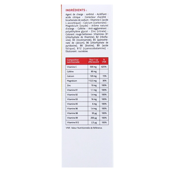 Agent de charge : sorbitol – Acidifiant : acide citrique – Correcteur d’acidité : bicarbonate de sodium – Vitamine C (acide L-ascorbique) – Calcium (carbonate) – Magnésium (oxyde) – Arôme naturel d’orange – Caféine – Anti-agglomérant : polyéthylène glycol – Zinc (citrate) – Colorant : rouge betterave – Vitamines : B1 (chlorhydrate de thiamine), B2 (riboflavine), B3 (nicotinamide), B5 (pantothénate de calcium), B6 (chlorhydrate de pyridoxine), B8 (biotine), B9 (acide folique), B12 (cyanocobalamine) – Édulcorant : sucralose.