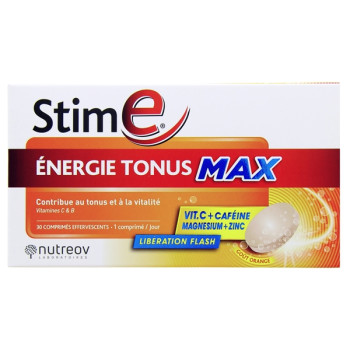 StimE Énergie Tonus Max des laboratoires Nutreov est un complément alimentaire à libération flash qui contient de la vitamine C, de la caféine, du magnésium et du zinc pour favoriser le tonus et la vitalité.