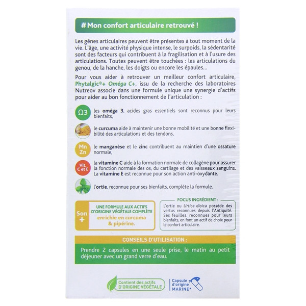 Ce complément alimentaire contient de l’huile de poisson et de l’huile de pépins de cassis. Les oméga-3, aux propriétés anti-inflammatoires, contribuent à réduire les sensibilités articulaires et favorisent une meilleure mobilité. Ce supplément renferme aussi de la vitamine C qui est indispensable à la production de collagène pour soutenir la structure des cartilages et pour préserver leur intégrité. Quant à l’huile de pépins de cassis, elle est source naturelle d’antioxydants pour protéger les cellules des articulations contre le stress oxydatif. Le Phytalgic Oméga C+ est aussi enrichi en manganèse et en zinc qui contribuent à renforcer l’ossature. La vitamine E pour sa part assure une action antioxydante, et l’ortie complète la formule avec ses propriétés détoxifiantes.
