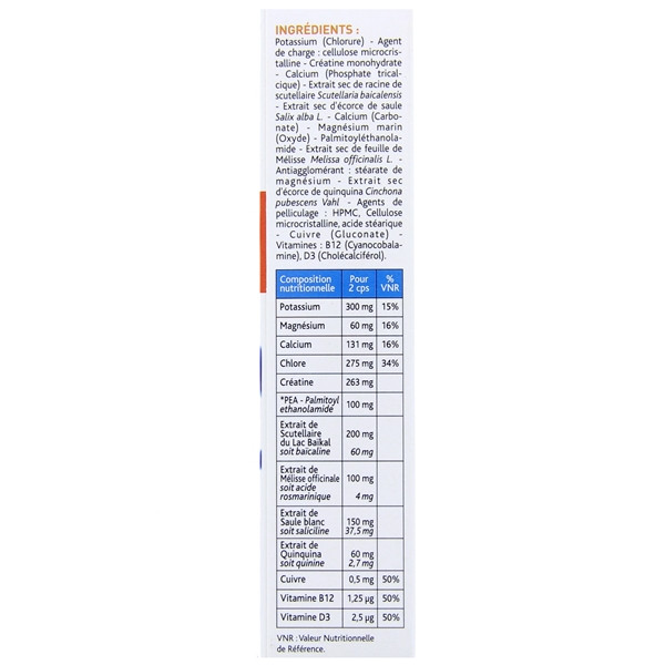 Potassium (Chlorure) - Agent de charge : cellulose microcristalline - Créatine monohydrate - Calcium (Phosphate tricalcique) - Extrait sec de racine de scutellaire Scutellaria baicalensis - Extrait sec d’écorce de saule Salix alba L. - Calcium (Carbonate) - Magnésium marin (Oxyde) - Palmitoyléthanolamide - Extrait sec de feuille de Mélisse Melissa officinalis L. - Antiagglomérant : stéarate de magnésium - Extrait sec d’écorce de quinquina Cinchona pubescens Vahl - Agents de pelliculage : HPMC, Cellulose microcristalline, acide stéarique - Cuivre (Gluconate) - Vitamines : B12 (Cyanocobalamine), D3 (Cholécalciférol).