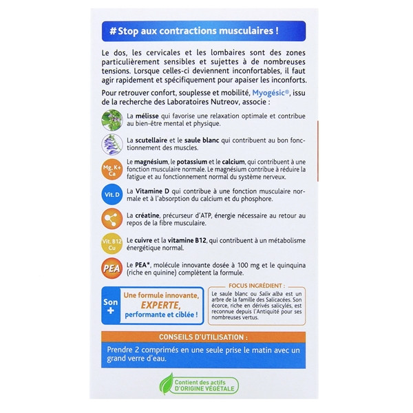 Myogésic Décontractant Musculaire des laboratoires Nutreov est un complément alimentaire indiqué pour apaiser et relaxer les contractions musculaires au niveau du dos, des cervicales et des lombaires afin de retrouver confort, souplesse et mobilité.