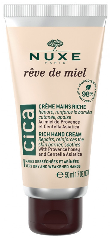 Rêve de Miel Crème Mains Cica Riche 50ml de la marque Nuxe est indiquée pour réparer et apaiser les mains abîmées et desséchées. Ce soin atténue les sensations d’inconfort, restaure la peau endommagée par les gerçures. Il renforce la barrière hydrolipidique et protège contre les agressions climatiques ou le lavage fréquent des mains.