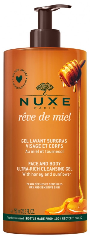 Rêve de Miel Gel Lavant Surgras Visage et Corps de la marque Nuxe nettoie, apaise et adoucit les peaux sèches et sensibles.