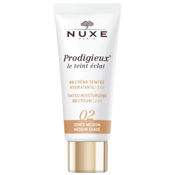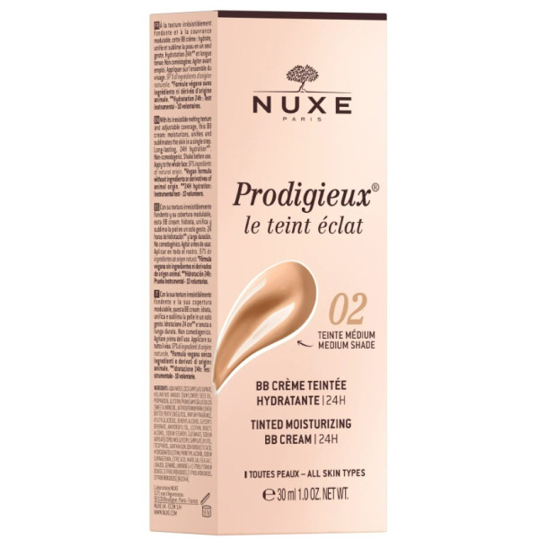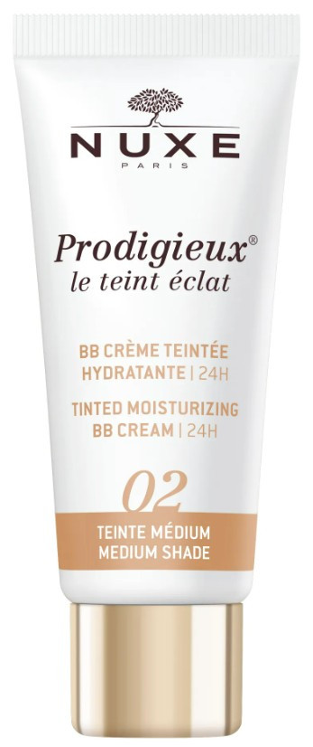 Prodigieuse BB Crème Teintée Hydratante 02 Médium de la marque Nuxe unifie le teint tout en hydratant la peau pour un effet bonne mine immédiat. La peau est lissée, toute douce et lumineuse.