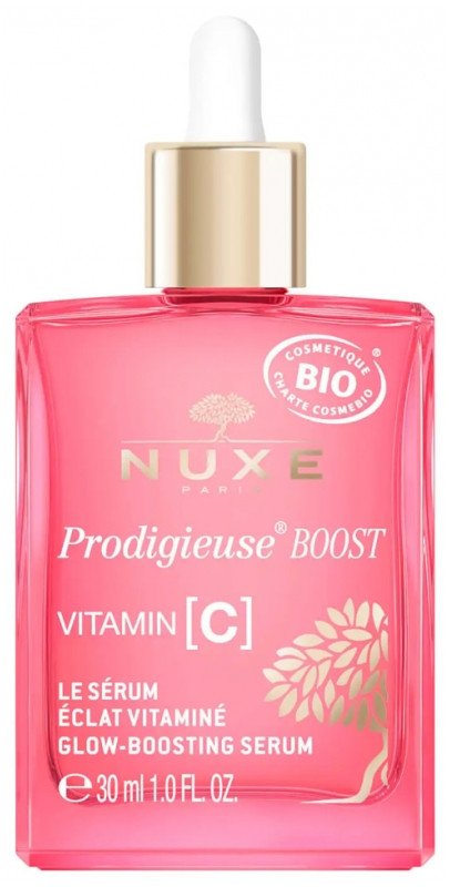 Prodigieuse Boost Le Sérum Éclat Vitaminé Bio à la vitamine C de la marque Nuxe agit sur les premiers signes de l'âge de tous les types de peaux. Ce sérum lisse, repulpe, illumine et protège la peau.