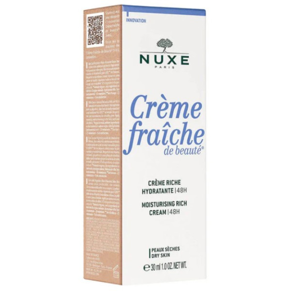 Crème Fraîche de Beauté Crème Riche Hydratante 48h de la marque Nuxe est destinée aux peaux sèches. Cette crème booste l'hydratation pendant 48 h et nourrit la peau sans un effet gras. Ainsi, la peau retrouve un confort.