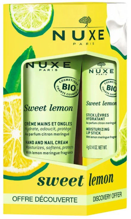 NUXE vous propose son duo Sweet Lemon Crème Mains et Ongles Bio + Stick Lèvres Hydratant Bio pour vous aider à mieux prendre soin de votre épiderme. Utilisés ensemble ces produits assurent une expérience de soin naturelle et gourmande aux peaux sèches et/ou fragilisées.