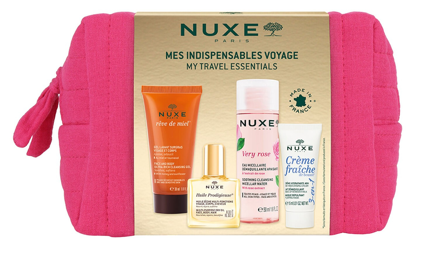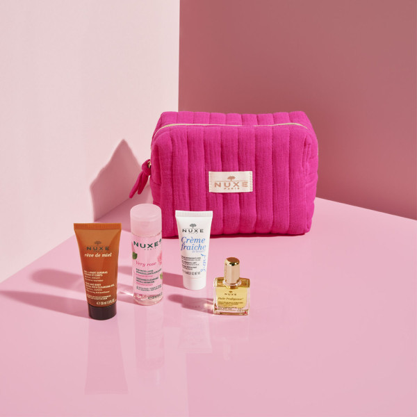 Dans cette trousse vous trouverez : un Gel Lavant Surgras Visages & Corps 30 ml, une Eau Micellaire Démaquillante Very Rose, Une Crème Hydratante 48 h Crème Fraîche de Beauté et une Huile Prodigieuse 10 ml.