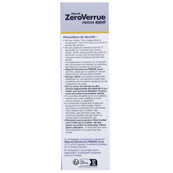 Objectif ZeroVerrue Freeze Excel Stylo convient aux adultes et aux enfants de plus de 4 ans. Ce dispositif médical est sans danger et simple d'utilisation, avec un marquage CE 0459, garantissant sa conformité aux normes de sécurité européennes. Son package contient 1 stylo et 9 embouts jetables.