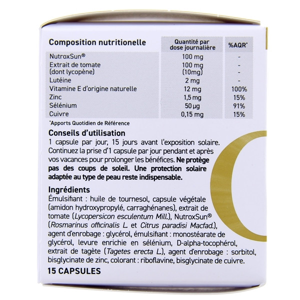 Dans 1 capsule : NutroxSun® : 100 mg Extrait de tomate : 100 mg dont lycopène : 10 mg Lutéine d’origine végétale : 2 mg Vitamine E d’origine végétale : 12 mg. Zinc : 1,5 mg. Sélénium : 50 µg. Cuivre : 0,15 mg.