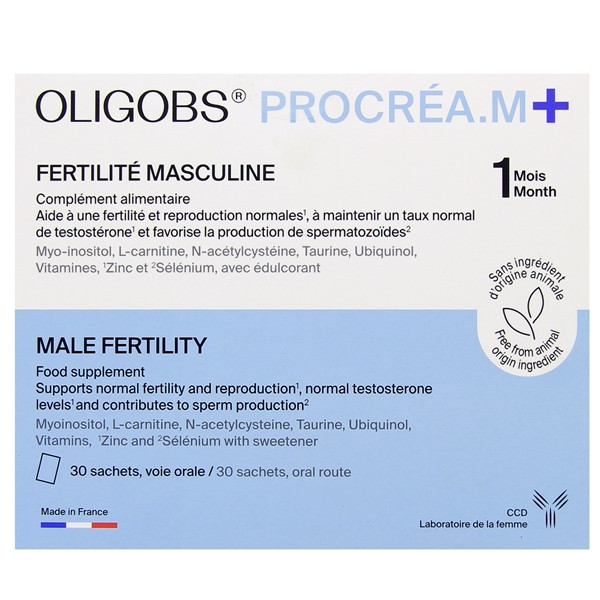 Grâce à une association équilibrée des oligo-éléments, des vitamines et des acides gras essentiels (oméga 3), Oligobs Procrea M+ des Laboratoires CDD est recommandé aux hommes désirant concevoir un enfant.