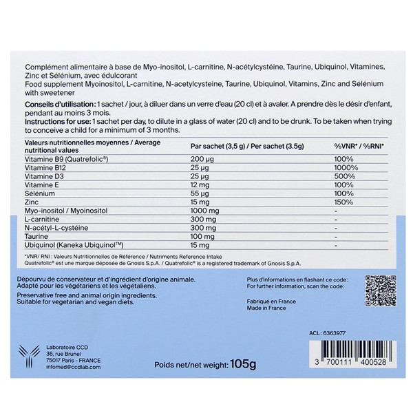 Myo-inositol, L-carnitine-L-tartrate, taurine, N-acétyl-L-cystéine, bisglycinate de zinc, L-sélénométhionine, ubiquinol Kaneka Ubiquinol (soja), acétate de D-alpha-tocophéryle (vitamine E), cholécalciférol d'origine végétale (vitamine D3), agent de charge : gomme d'acacia, édulcorant : glycosides de stéviols issus de Stévia, acide (6S)-5-méthyltétrahydrofolique sous forme de sel de glucosamine Quatrefolic (vitamine B9) - méthylcobalamine (vitamine B12), acidifiant : acide citrique, arôme naturel d'orange (avec autres arômes naturels) (2,0%).